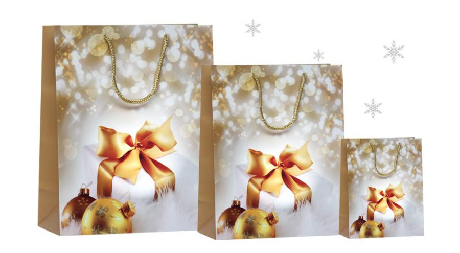 Weihnachtstüten "Schleife Gold" aus einem gestrichen Papier in weiß 150 g/qm und mit einer Mattlaminierung veredelt. Das wunderschöne elegante Motiv mit Kugeln in gold und einem edeln Geschenk mit großer goldener Schleife, besticht durch eine schlichte und zugleich edle Optik. Diese Weihnachtstüten erhalten Sie in drei praktischen Größen, für jeden Anlass. PP Kordeln in gold, die innen mit einem Clips befestigt sind, dienen als Trage-Griff. Unsere Weihnachtstüten Schleife-Gold haben zwar keine Verstärkung im Randumschlag, jedoch sorgt ein eingeklebter Bodenkarton dafür, dass das Gewicht gleichmäßig über den kompletten Taschenboden verteilt wird und gibt dadurch den Taschen zusätzliche Stabilität.