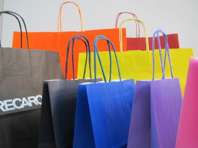 elegante Papiertaschen mit gedrehter Papierkordel nachträglich ab 500 Stück im Flexodruck bedruckt oder mit Heißfolienprägung ab 250 Stück